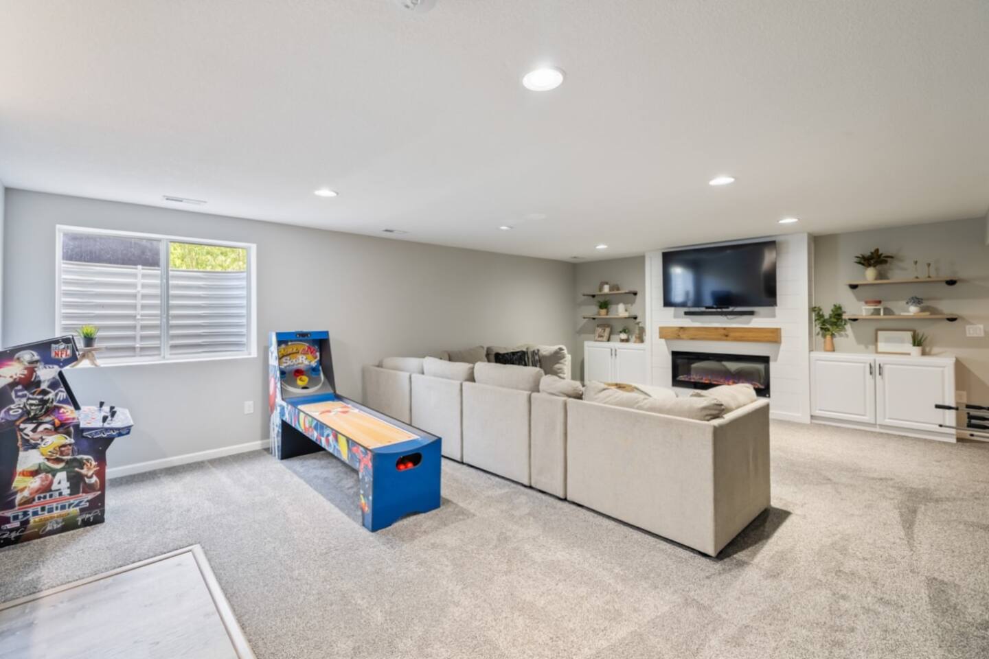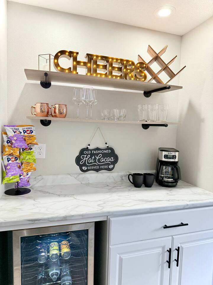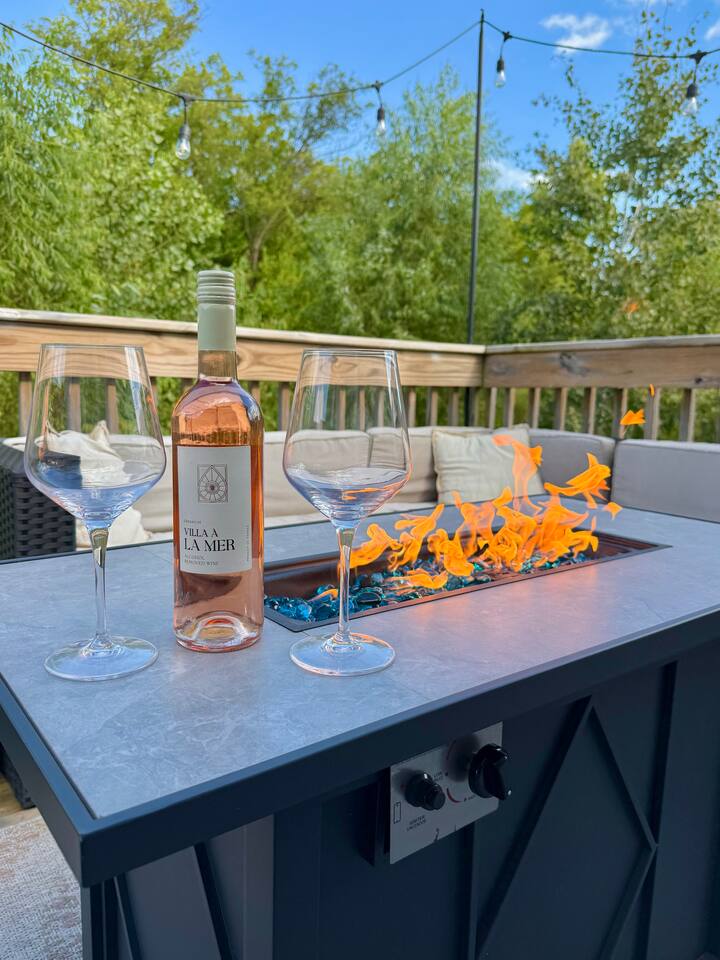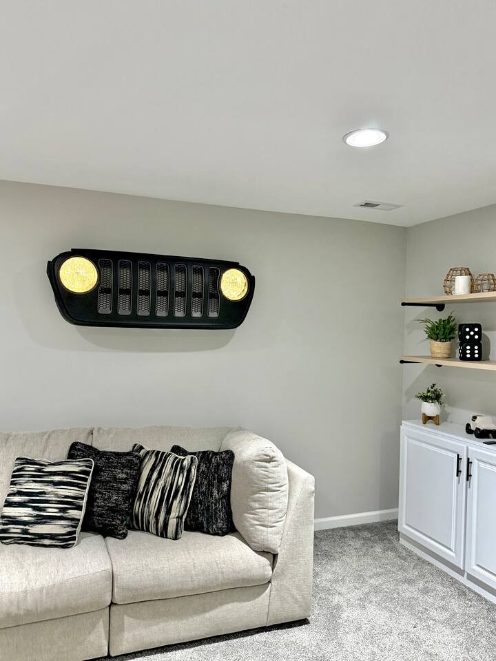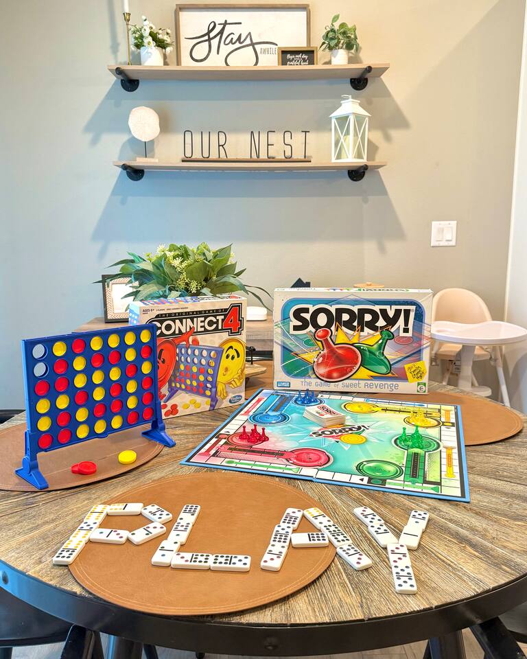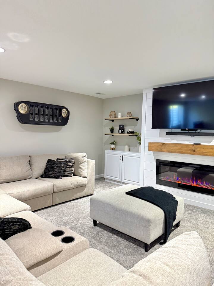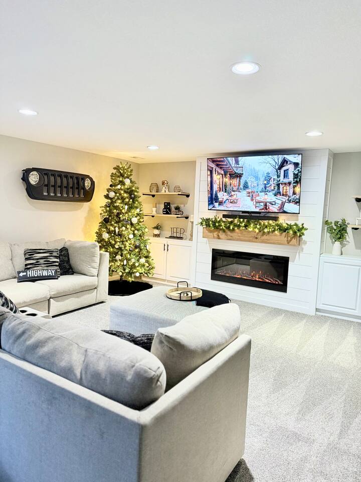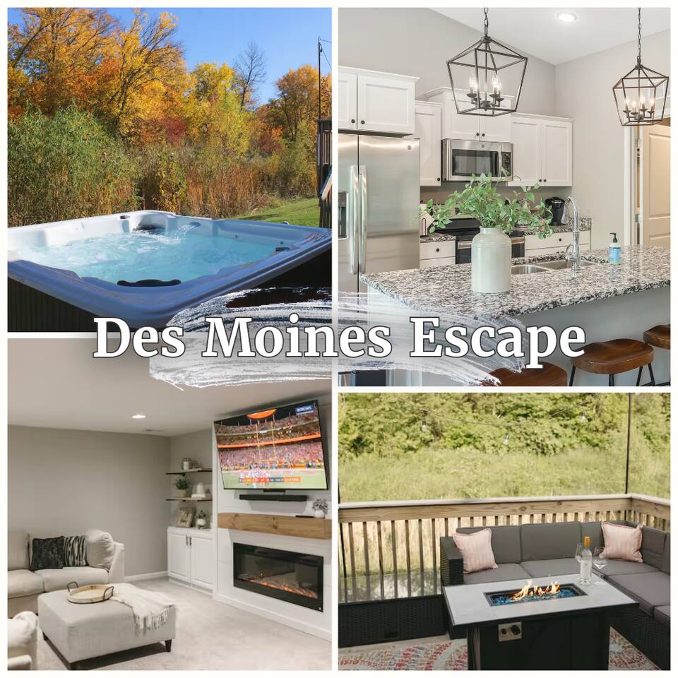 Quick note before we get into the details! From November through January, the home includes seasonal holiday decor, including a Christmas tree and cozy winter touches to make the space feel festive and welcoming. If you’d prefer the decor be removed before your stay, just let us know and we’ll be happy to accommodate. What You’ll Love: • Keyless entry for easy check-in • Fully stocked kitchen with complimentary coffee & snacks • 6-person hot tub overlooking a private tree-lined backyard • Huge basement game loft with foosball, arcade games, and more • Cozy fire pit area with string lights and outdoor sectional • Fast Wi-Fi, Roku Smart TVs, and workspace options • Family-friendly touches like a high chair, pack & play, and kid-friendly dinnerware The open-concept main floor makes it easy for your group to cook, relax, and hang out together, while the split-level layout offers added privacy for those who want a little quiet time. Main Level Highlights: • Spacious living room with a 65” Smart TV, and plenty of games • Chef-ready kitchen with island seating, gadgets, soft-close cabinets, stainless appliances and dishwasher + Keurig and pour-over options • 3 bedrooms (1 king, 2 queens) and 2 full bathrooms. The king bedroom features a 65” Smart TV, and one of the upstairs queen bedrooms includes a 55” Smart TV. • Laundry room and mudroom just off the kitchen • Walk-in shower in the primary suite + hallway bath with tub/shower combo • Design details such as our colorful photo wall, blackout curtains, and thoughtful touches throughout Lower Level Game Loft: Step into your own entertainment zone featuring: • Foosball, NFL arcade game, Roll & Score, fireplace • Third 65” Smart TV with live and streaming access • Mini bar with a drip coffee setup and barware • 4th bedroom with queen bed + extra air mattress • Full bathroom with walk-in shower and hotel-style amenities Outdoor Features: The outdoor space is intimate but thoughtfully designed, blending a comfortable deck with a charming yard area ideal for soaking, relaxing, dining, or enjoying the evening breeze. • Relax in the private hot tub facing peaceful trees • Roast marshmallows at the gas fire pit under string lights • Grill out with the gas BBQ or enjoy a drink on the raised deck • Challenge your group to a game of corn hole • Enjoy a calm morning with coffee or unwind after a long day at Adventureland Garage access is not included, though limited use of the two-car garage may be available upon request and is not guaranteed. Parking is available for up to 6 standard-size vehicles, with space for 4 in the driveway and 2 off-street. Location Perks: • 2 miles to Adventureland, Outlets of Des Moines, Prairie Meadows Casino • 10 minutes to Downtown Des Moines, the Casey’s Center, and the Iowa State Fairgrounds • 20 minutes to the Des Moines International Airport and Blank Park Zoo
